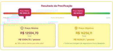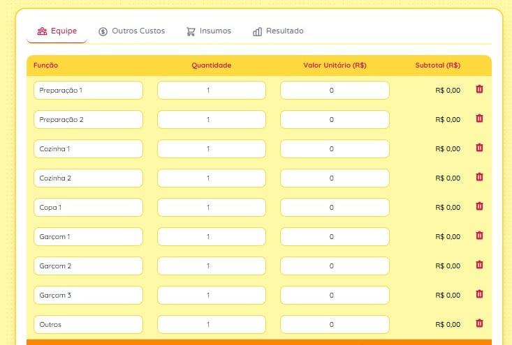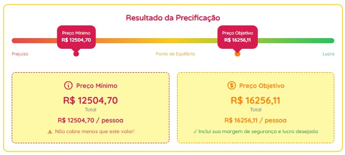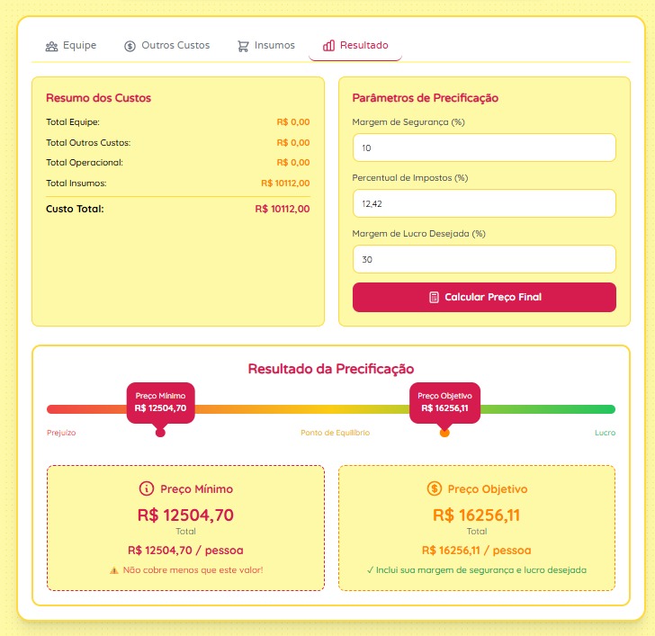 Você preenche seus custos, escolhe o tipo de evento, e ela calcula tudo pra você: