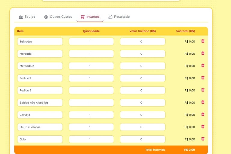 Você preenche seus custos, escolhe o tipo de evento, e ela calcula tudo pra você: